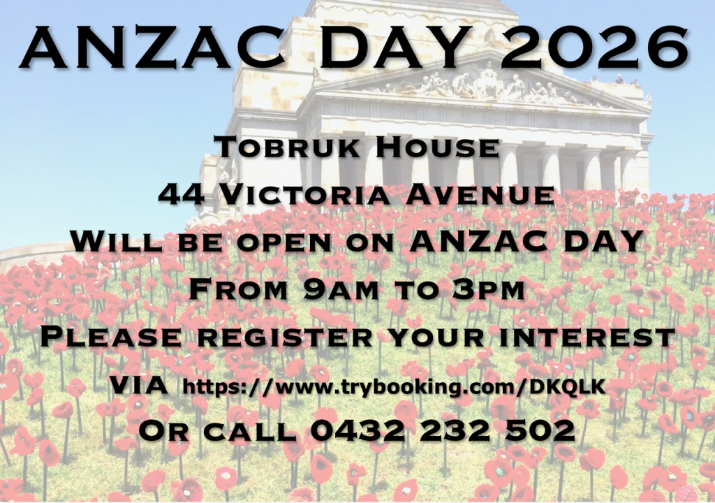 Tobruk House 44 Victoria Avenue Will be open on ANZAC DAY From 9am to 3pm Please register your interest via Glenda Garde 0432 232 502
